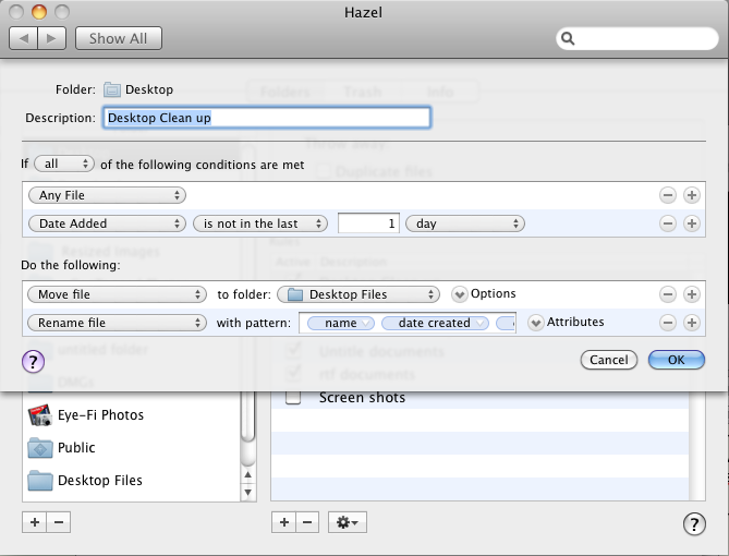 I’ve written a little about a must-have application called Hazel ($21.95). This powerful program will automatically clean up your desktop and other Finder folders, including the trash can. One rule I have set up in Hazel moves all files on my desktop to a designated folder in my documents folder when those files have been on the desktop for 24 hours. In turn, Hazel automatically trashes those moved files after they have been in the designated folder for more than 15 days. The same goes for screen shot files with a .png extension. Those files are moved off my desktop to a designated folder after they have been there for two hours.