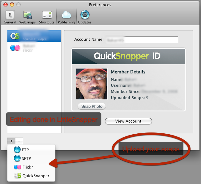 Snapshots can of course be exported out as full PDF, JPEG, TIFF, and PNG files. And just like with iPhoto, you can drag selected snapshots out of LittleSnapper onto your desktop or into any other supporting application. This application also goes one step further and enables you to upload your snapshots directly to your Flickr account or to RealMac's QuickSnapper, a site designed to compliment the LittleSnapper desktop. LittleSnapper users can share, comment on, and search uploaded snaps by other members. Just as with images posted on Flickr or Picasa, QuickSnapper provides HTML link coding for each uploaded snap. If you're a Tweeter, you can post snaps directly from QuickSnapper to your account. You can of course FTP and SFTP publish snaps to your own webserver.