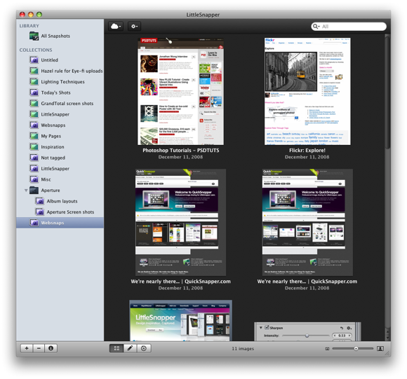 Though I don't snap entire entire web pages very often, that's exactly what LittleSnapper can do. In it's press release, Realmac explains it well: "LittleSnapper can take a snapshot of any given web address from its system-wide menubar item, through a customisable system-wide keyboard shortcut that snaps the current web address from a users' browser, or using the built-in LittleSnapper Browser. The built-in browser, based on the powerful WebKit rendering engine that powers Apple's Safari web browser, allows a user to load a web address inside the application itself and snap (for example) a site that has interactive Flash content and capture specific page elements without the need for cross-hairs with its intelligent element selection. LittleSnapper also allows the user to take full-screen, area and window-based screenshots on their Mac desktop, and the snaps are also added to the LittleSnapper library." This feature indeed has worked entirely well based on my testing.