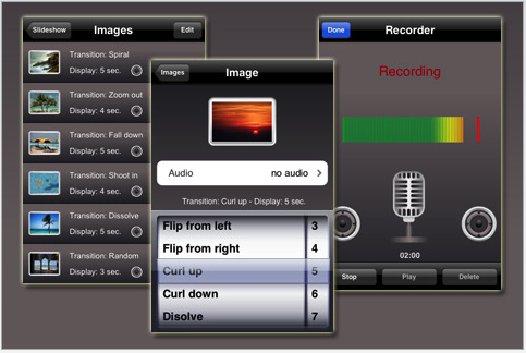 My application of choice so far is Photo Show, which has the same options and features as Apple's default slideshow feature. But it alos contains a dozen or so more transitions than what Apple offers. In addition, it comes with a dozen musical loops that you can use for background music. You can also add mp3 music files via a web browser to Photo Show, as well export slideshows created with the application.