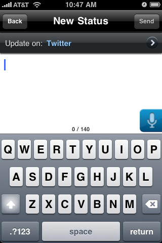 For FaceBook and Twitter users, Vlingo offers direct connections. After launching the application you can start by saying, “Twitter update,” or “FaceBook update,” followed by the message you want to dictate. When you’re done, Vlingo will use its social networking client to send your completed messages. You of course need to sign into your respective accounts using the Vlingo settings. A really nice added touch to this voice recognition program is that you can correct dictation errors or add more text with the built-in keypad before hitting the send button.